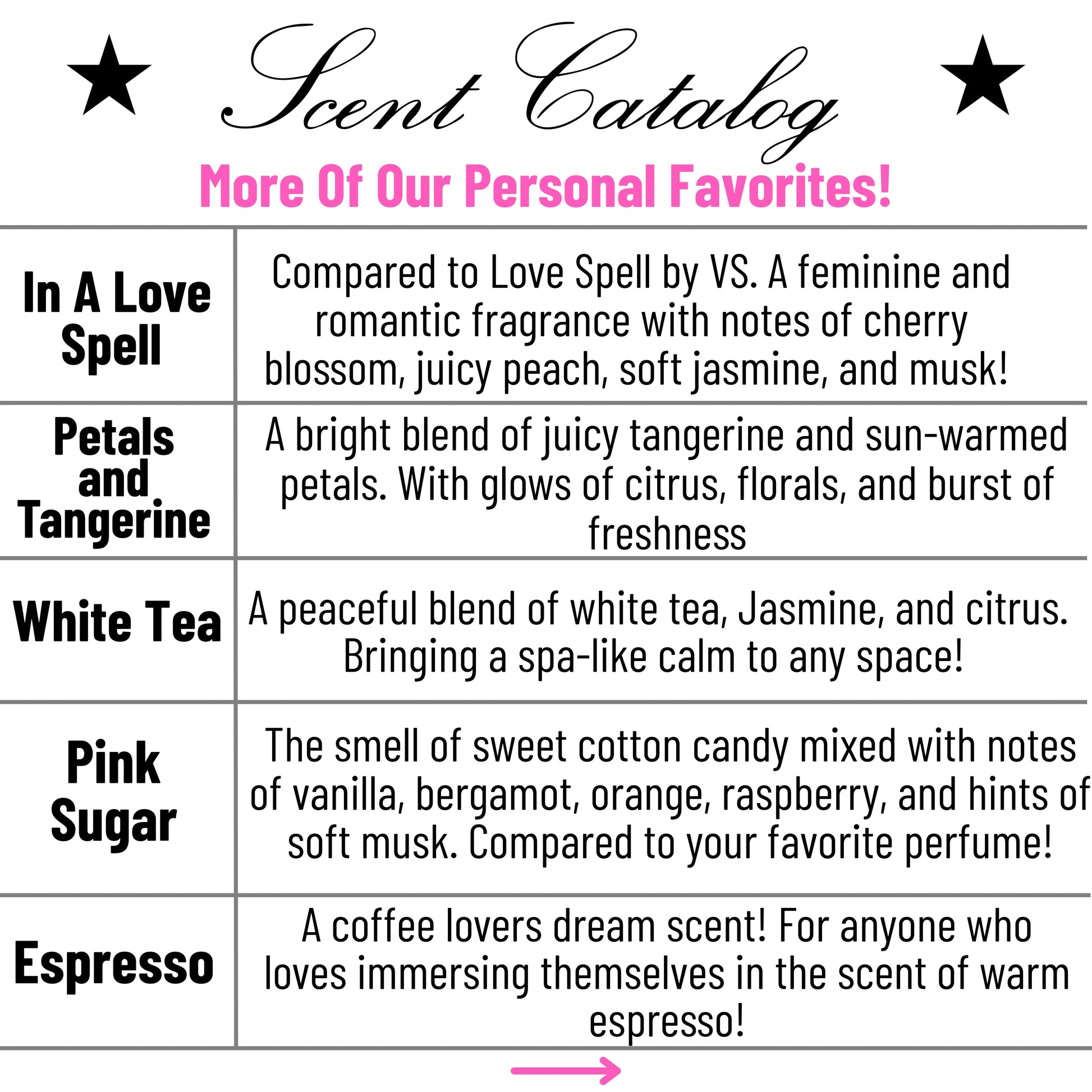Pink Sugar - The smell of sweet cotton candy mixed with notes of vanilla, bergamot, orange, raspberry, and hints of soft musk. Compared to your favorite perfume!