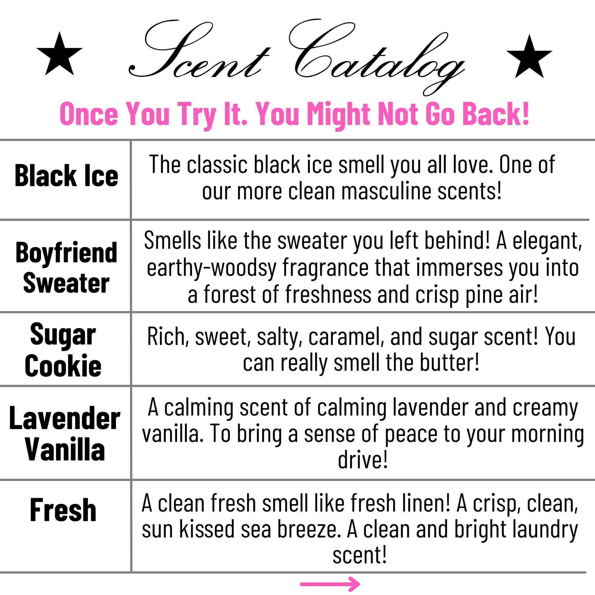 Lavender Vanilla - A calming scent of calming lavender and creamy vanilla. To bring a sense of peace to your morning drive.
